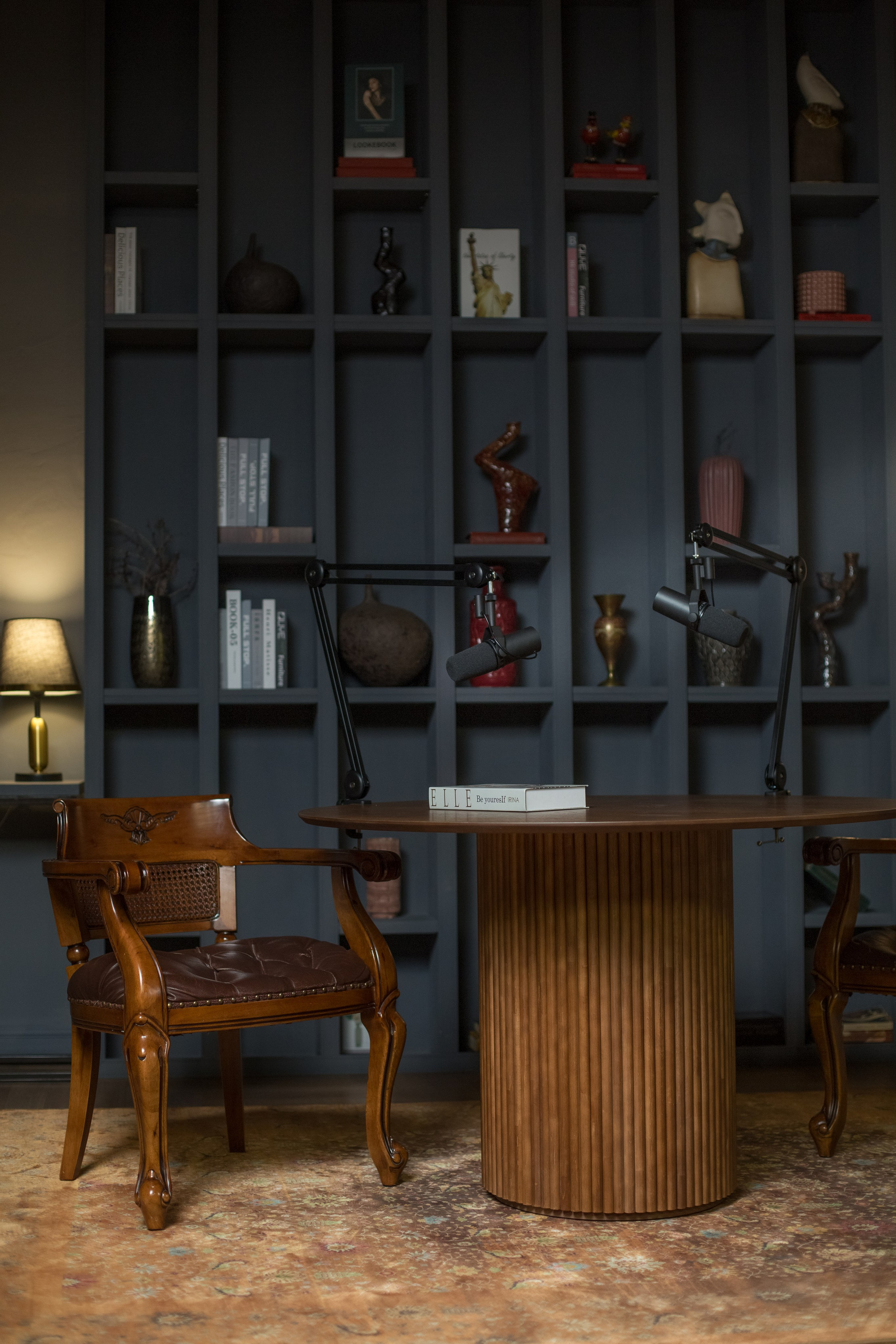 Зал выполнен в темной тональности, объединяет в себе четкость и лаконичность композиций и форм. Элегантный, но в то же время брутальный. Стильно и современно оформлена зона интервью, в зале имеется диван, кресла, зона кабинета, уникальные элементы декора. Для онлайн трансляций доступен интернет с исходящей скоростью 100 мб/с. Возможна установка внешнего источника света за окном, доступ к розетке 380 Вт.