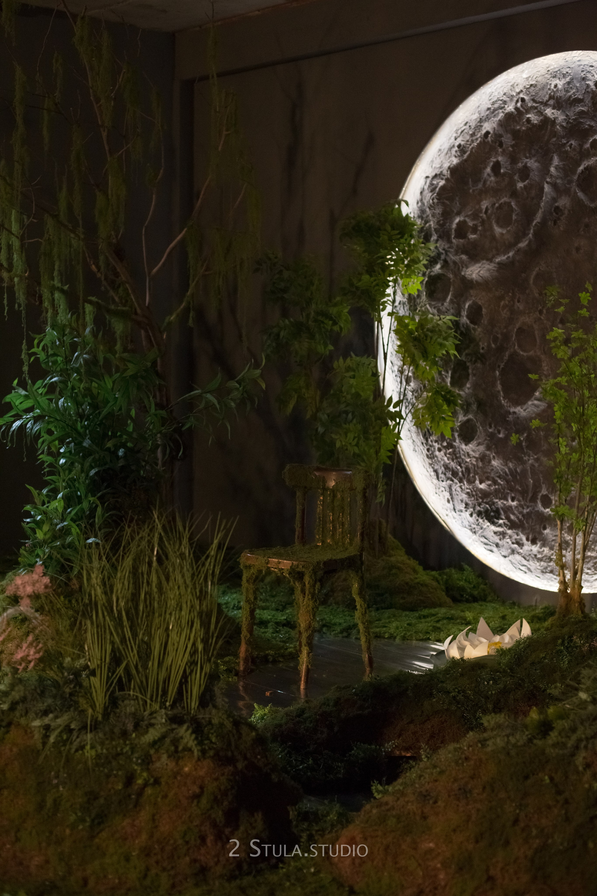 Зал выполнен в темной тональности, в зале находится стена-скала, огромная луна с подсветкой. Наша луна это особенный космический объект в студии, созданный любящими сердцами и руками для вас и вашего творчества!