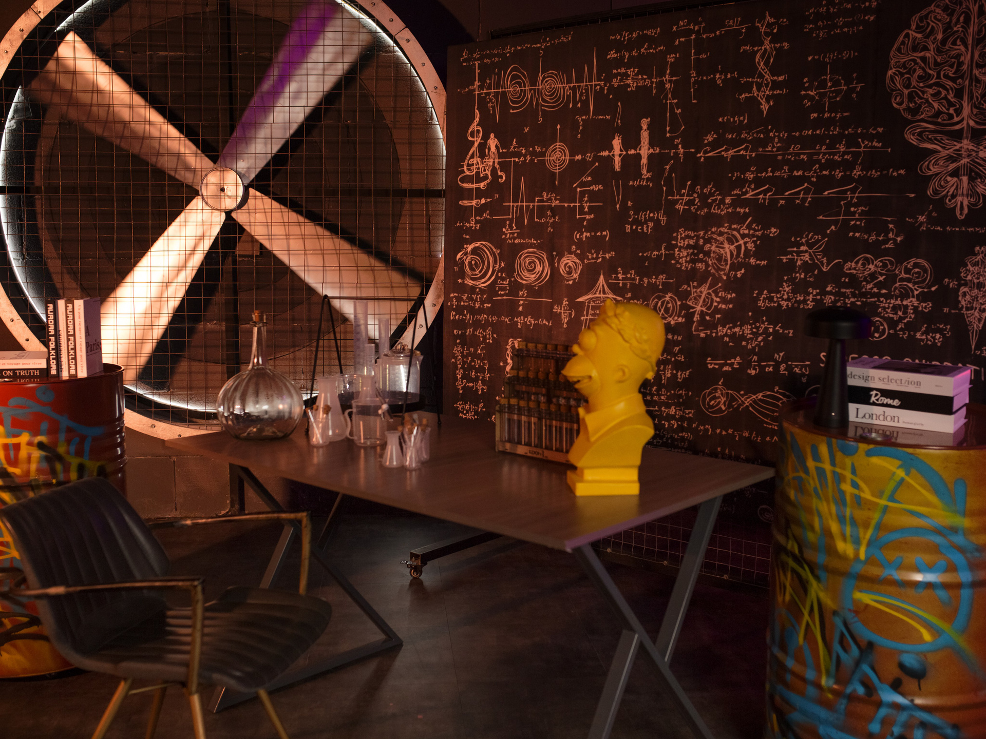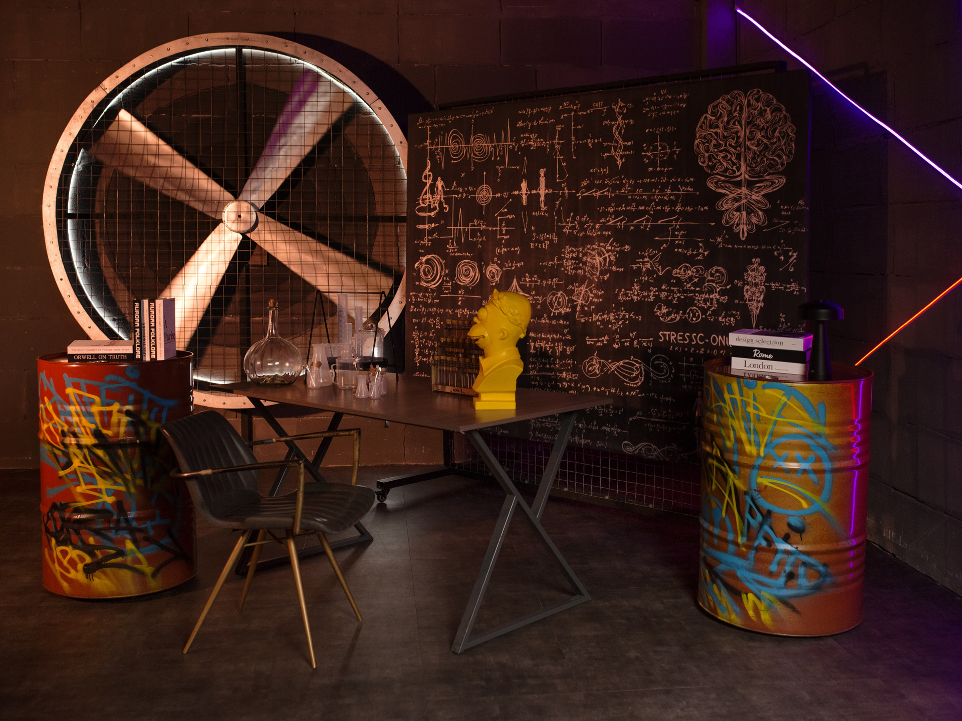 Зал оформлен в индустриальном стиле и создаёт промышленную атмосферу. Крутящийся вентилятор с подсветкой в рост человека, напоминающий пропеллер, позволит снимать тематические фото и видео съемки. Отлично подходит для съемок танцевальных групп, фэшн съемок и других уникальных кадров. Витражная и неоновая стена, диван, кресла, тематика в стиле «Отель», позволяют создать особый колорит в кадре. Для онлайн трансляций имеется интернет с исходящей скоростью 100 мб/с. Возможна установка внешнего источника света за окном.